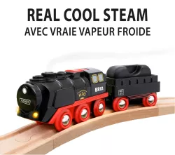 Sada s parnou lokomotívou, ktorá vytvára bezpečný efekt pary, nadchne každé dieťa aj dospelého. Stačí ju umiestniť okolo stojana vianočného stromčeka a sledovať, ako sa vláčik rozbieha po drevených a zasnežených koľajniciach. Vďaka premyslenému spracovaniu pôsobí pohyb aj para veľmi realisticky. Lokomotíva funguje na 2× AAA batérie (nie sú súčasťou) a vodu možno jednoducho doplniť do zásobníka.