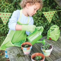 Taška s pekne vyvedenými červenými lienkami zahŕňa a pojme všetko, čo malý záhradník potrebuje, rýľ, lopatku, kypriace hrabličky, kanva aj rukavice. Malí záhradníci ju budú milovať. Náradie, kanva a rukavice, všetko na kopanie hliny a zalievanie rastlín s mamou a otcom. Elastické zápästia záhradných rukavíc zaisťujú, aby do rukavíc nič nepadalo a aby sa neskĺzli. Kropiaca kanva je vybavená pevnou hubicou a hornou aj bočnou rukoväťou, ktoré uľahčujú držanie malým ručičkám. Sada sa skladá zo 6 kusov. Bigjigs Toys tiež ponúka široký rad záhradných doplnkov zahŕňajúcich napríklad náhradné rukavice a ručné náradie, náradie s dlhou rukoväťou, kolieska, kanvy a zásteru.