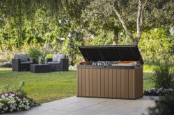 Nájdite pre box ideálne miesto na záhrade. Vďaka štruktúre, ktorá pripomína drevo, zapadne do každého prostredia. Uložené veci navyše môžete uzamknúť vo vnútri boxu. Hydraulický piestový systém zaistí plynulé a bezpečné zatváranie a otváranie veka. Po zatvorení sa na neho navyše usadí až 2 ľudí.