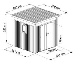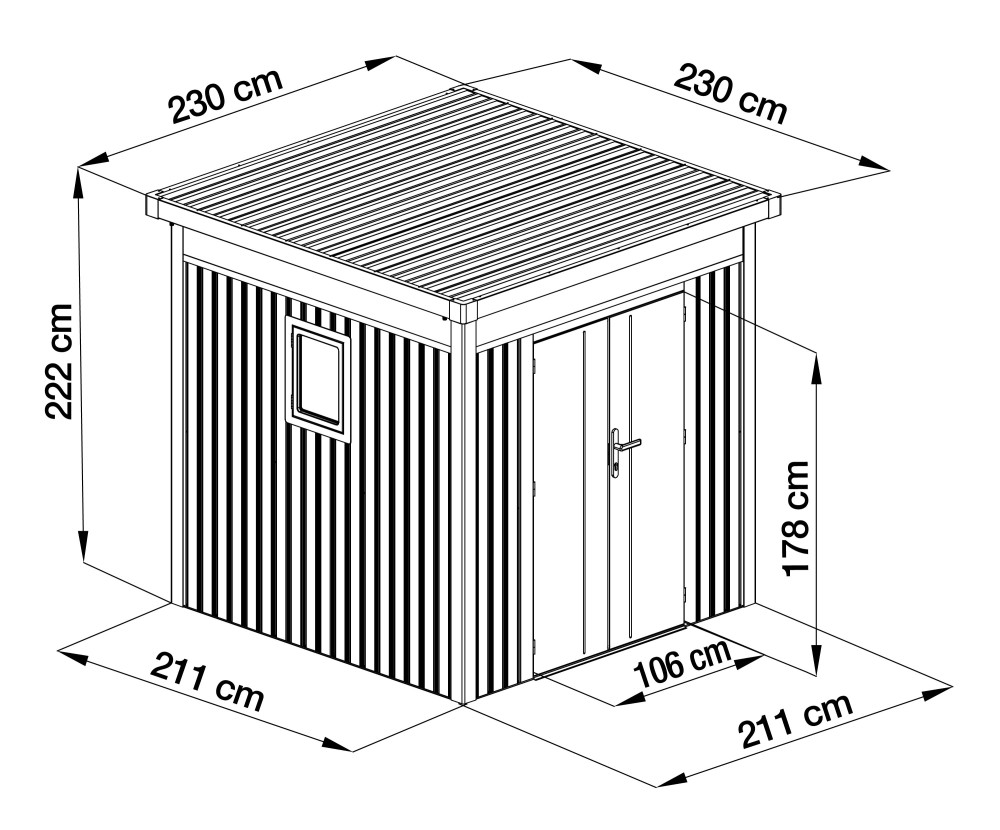 - Vonkajšie rozmery so strechou (š x v x d): 230 x 222 x 230 cm