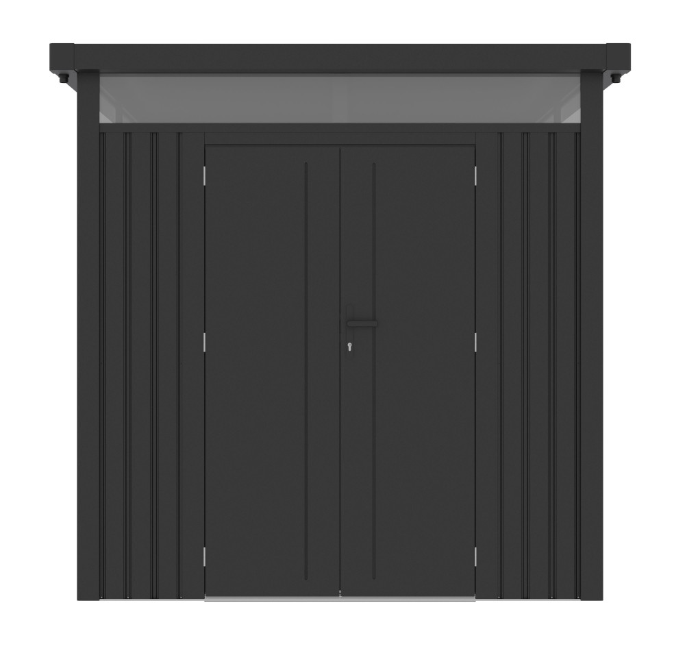 Komfort užívania podčiarkujú dvojstenné dvere s nadštandardnou priechodnou výškou 178 cm, vďaka ktorej prejdete vzpriamene aj s rozmerným nákladom. Dvere sú osadené klasickou kľučkou a zámkom, ktorý je súčasťou balenia, takže vaše veci zostanú v bezpečí. Praktickým bonusom je strecha s integrovanými odkvapmi, ku ktorým môžete ľahko napojiť odtokovú hadicu a zachytávať dažďovú vodu do suda pre ďalšie využitie, napríklad na polievanie záhradky.