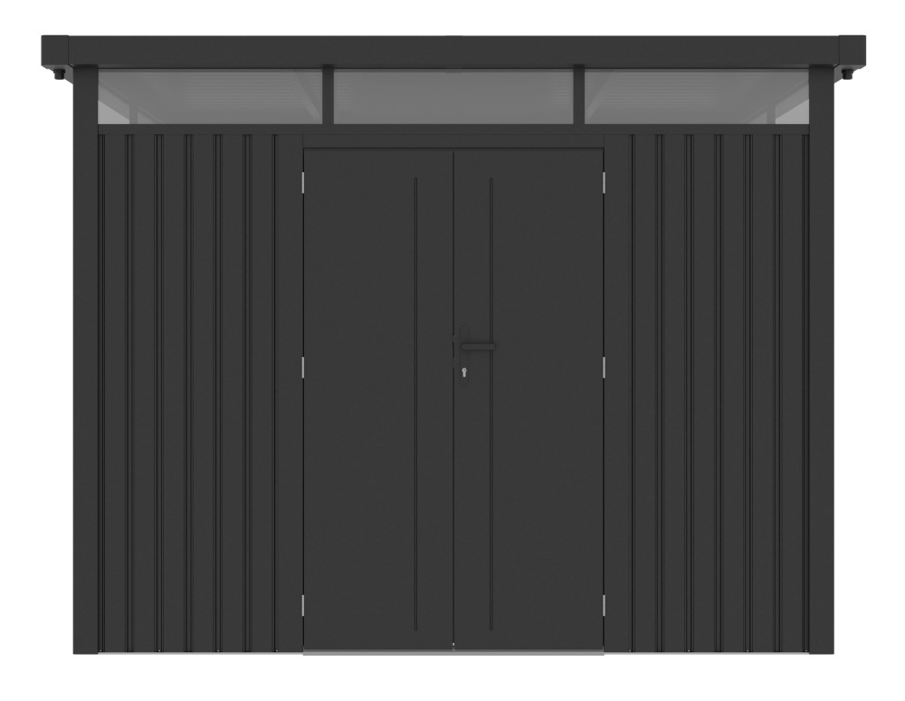 Komfort užívania podčiarkujú dvojstenné dvere s nadštandardnou priechodnou výškou 178 cm, vďaka ktorej prejdete vzpriamene aj s rozmerným nákladom. Dvere sú osadené klasickou kľučkou a zámkom, ktorý je súčasťou balenia, takže vaše veci zostanú v bezpečí. Praktickým bonusom je strecha s integrovanými odkvapmi, ku ktorým môžete ľahko napojiť odtokovú hadicu a zachytávať dažďovú vodu do suda pre ďalšie využitie, napríklad na polievanie záhradky.