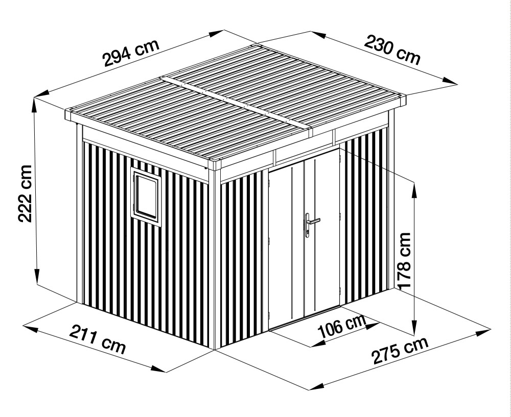 - Vonkajšie rozmery so strechou (š x v x d): 294 x 222 x 230 cm
