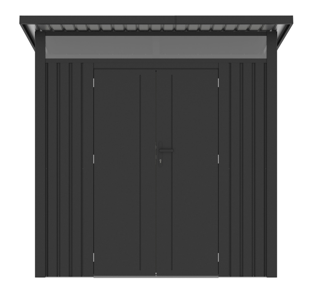 Komfort užívania podčiarkujú dvojstenné dvere s nadštandardnou priechodnou výškou 178 cm, vďaka ktorej prejdete vzpriamene aj s rozmerným nákladom. Dvere sú osadené klasickou kľučkou a zámkom, ktorý je súčasťou balenia, takže vaše veci zostanú v bezpečí. Praktickým bonusom je strecha s integrovanými odkvapmi, ku ktorým môžete ľahko napojiť odtokovú hadicu a zachytávať dažďovú vodu do suda pre ďalšie využitie, napríklad na polievanie záhradky.