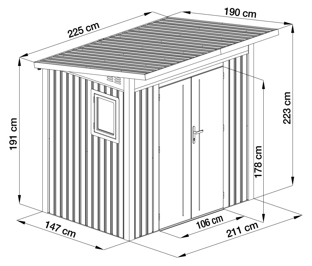 - Vonkajšie rozmery so strechou (š x v x d): 225 x 223 x 190 cm