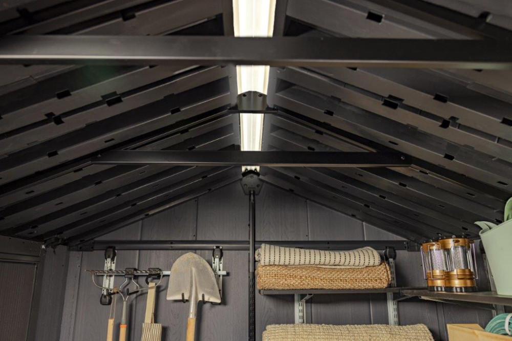 Vysoký strop uľahčuje pohyb vo vnútri domčeka a ventilačné otvory umiestnené vpredu, vzadu i po stranách zabezpečujú prirodzené prúdenie vzduchu. Praktické sú aj steny s možnosťou vŕtania, ktoré umožňujú pripevnenie políc, háčikov či držiakov na náradie, čo vám pomôže s organizáciou priestoru.