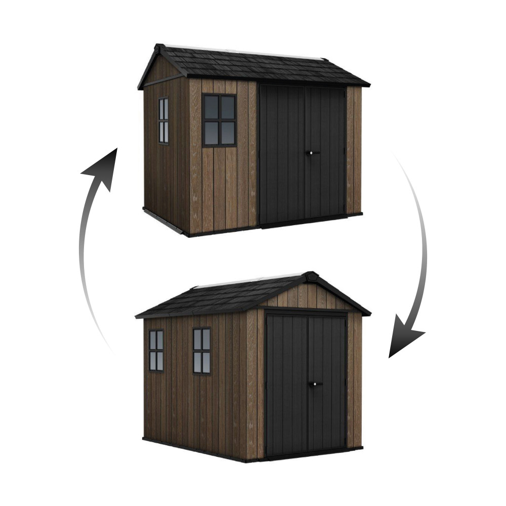 Jednou z najväčších výhod domčeka Apex je možnosť obojstrannej montáže. Sami si zvolíte, kam umiestniť okno a dvere, aby čo najlepšie vyhovovali rozloženiu vašej záhrady. Dvojité steny navyše zabezpečujú vysokú stabilitu a odolnosť konštrukcie.