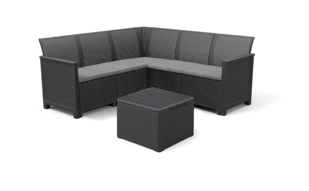 Vďaka nábytku Keter Elodie si na záhrade, terase, v pergole či na balkóne vytvoríte krásne a pohodlné posedenie. Pripravíte sa na slnečné dni, ktoré strávite pri káve na čerstvom vzduchu, alebo pozvete na návštevu svojich príbuzných a priateľov. Súprava obsahuje rohovú sedačku a stolík s praktickým úložným priestorom. Do neho môžete uchovať napríklad podsedáky. Celkovo vám poskytne 5 miest na sedenie.