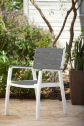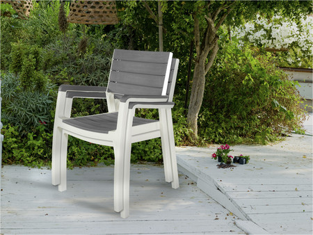 Záhradné stoličky Keter Harmony s čisto bielym rámom a šedými doskami pripomínajúcimi drevo sú veľmi pohodlné a vďaka premyslenej konštrukcii aj lakťovým opierkam sa v nich budete cítiť ako v kreslách.
