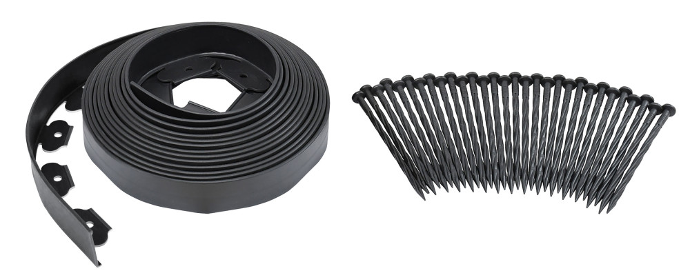 V základnom balení nájdete všetko. Ako obrubník s dĺžkou 10 m, tak aj 30 klincov pre po spoľahlivé uchytenie neviditeľného obrubníka k zemi. Na spodnej strane obrubníkového pásu sú otvory, do ktorých vložíte priložené klince a zatlčte ich.