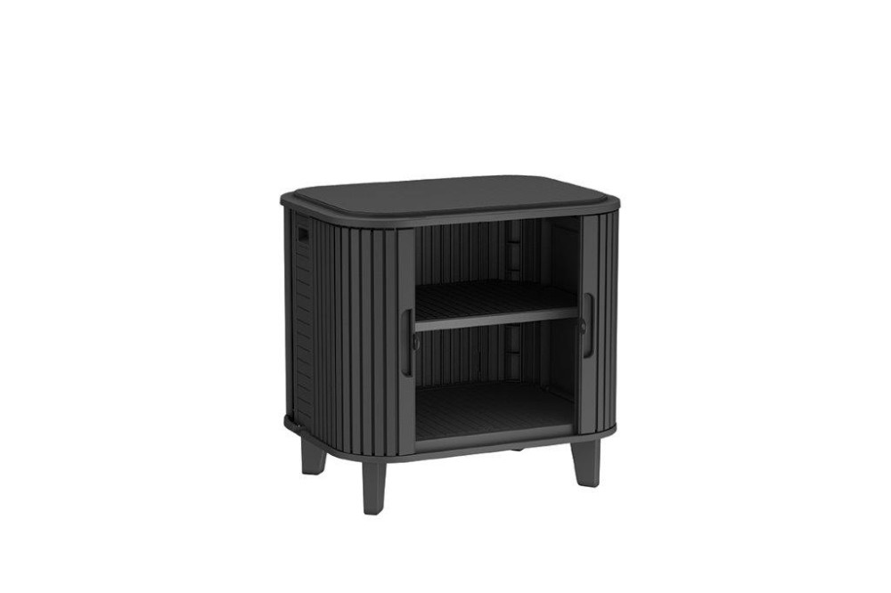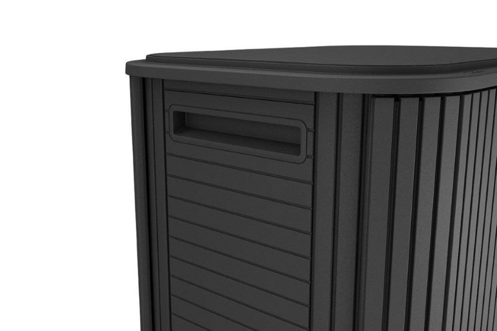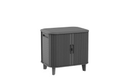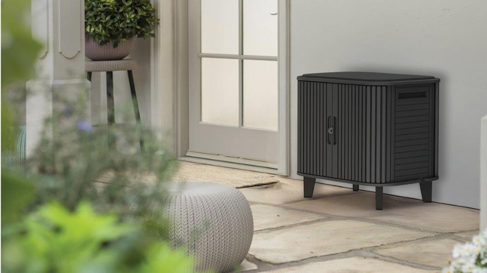 Grafitová farba s textúrou imitácie dreva dodáva stolíku moderný vzhľad, ktorý sa perfektne hodí k záhradnému nábytku i zvyšku záhrady. Kompaktné rozmery 62,4 × 59,3 × 47 cm umožňujú umiestnenie aj na menších terasách alebo balkónoch. Zvýšené nožičky (11,3 cm) zabezpečujú stabilitu a chránia obsah pred vlhkosťou zo zeme.