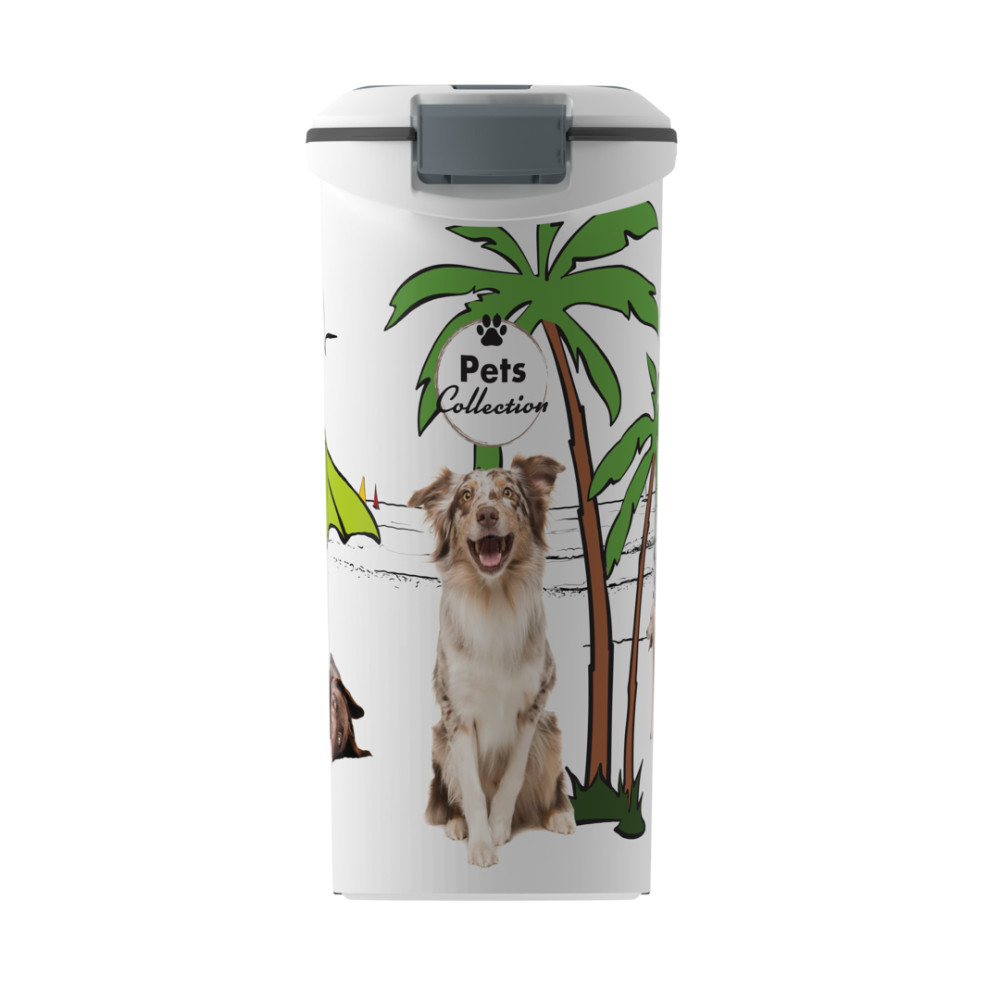 Kontajner má špeciálne veko s dômyselným dizajnom pre ľahké plnenie, ktoré je možné otvárať 2 spôsobmi. Súčasťou je tiež vnútorná stupnica pre presné dávkovanie, ktorá tak bude vždy zodpovedať správnemu množstvu. Zásobník je vybavený kolieskami pre ľahký prevoz, takže ho bez ťažkostí premiestnia dôchodcovia aj väčšie deti. Psí motív zaručene poteší každého psíčkara, keď je vpredu vyobrazený zlatý retriever za ktorým je more s loďkami a vedľa neho palmy, na strane sa nachádza ďalší kamarát.