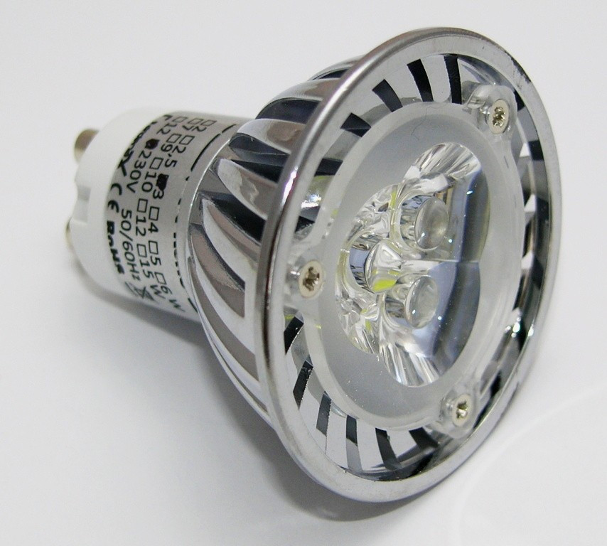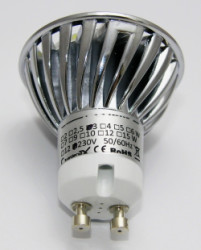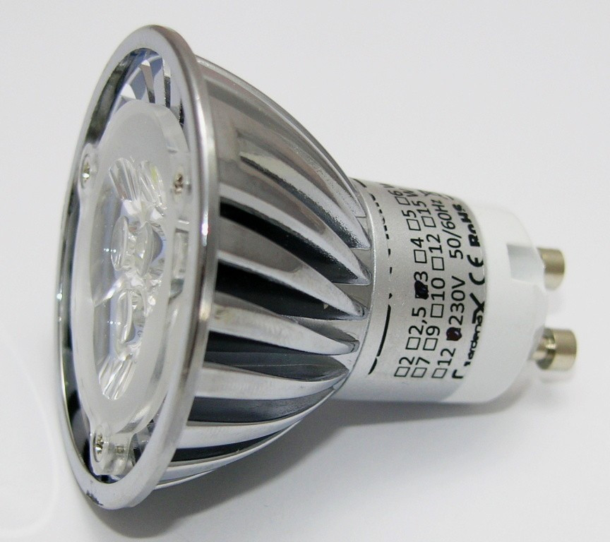 LED žárovka, patice GU10, napájení AC 230V, příkon 3W, barva světla 2700-3500K (teplá bílá), světelný tok 240lm, 3x LED typu SMD Everlight, úhel svitu 38°, náhrada 25W žárovky, životnost až 50 000 hodin.